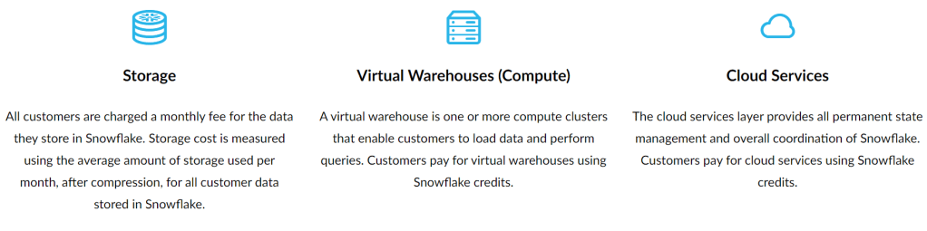 Snowflake prices on a consumption model (all the rage these days). The three levers it uses to determine that consumption are storage, compute, and cloud services.